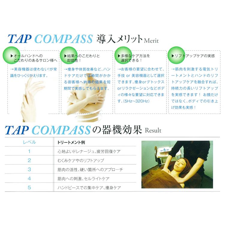 タップコンパス -TAP COMPASS-は身体を活性化する特殊電流(5Hz~320Hz)のケアを施術者が手で伝えていく新感覚のトリートメント機種です。